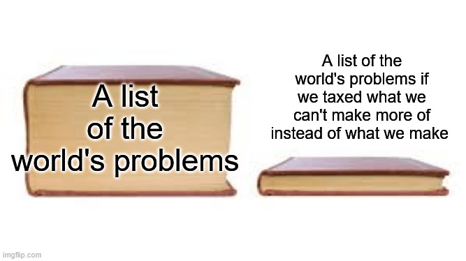 Simply put, we currently tax people for making and giving things, whether by taxing their work, investment, or trade, which discourages and prevents people from satisfying the wants and needs of others as much as otherwise possible. At the same time, we also allow people to hoard things that we can never make more of; things that are finite. This is bad because we can’t increase the supply of these things to reduce their prices and offset that hoarding. Land‘s the most important example, but this also applies to other natural resources like mineral deposits or water rights, or even artificially finite things like patent rights over particular innovations too. This increases the costs of both production and living to the point of forcing whoever’s unlucky enough to be locked out from these things into poverty, while throwing a massive wrench into the functioning of the economy and heavily increasing inequality.